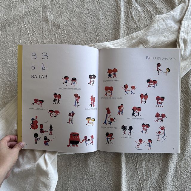 Este bello, novedoso y llamativo libro, presenta a cada letra con un verbo: abrir, bailar, comer, chocar… Y cada verbo construye una oración: abrir un libro, bailar toda la vida, comer con palitos, chocar el autor…